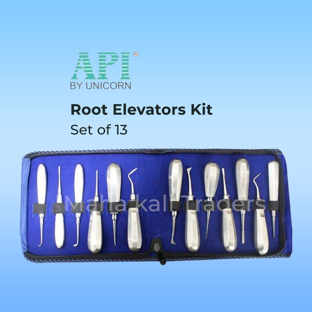 A complete set of 13 pcs root elevators containing apexo, straight, cryer and Warwick James pattern root elevators. These are lightweight, perfect balance and rust-free elevators.