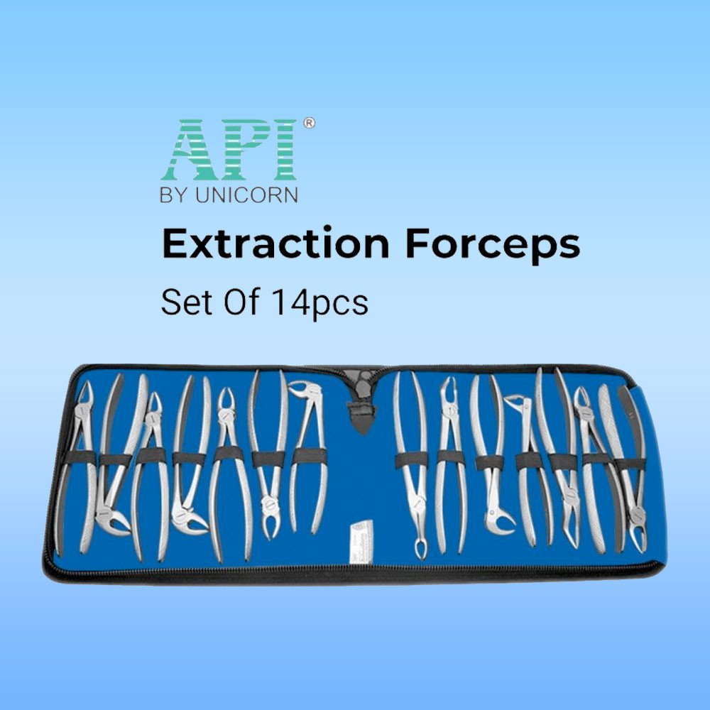 A complete set of 14 pieces extraction forceps set, for both maxilla and mandibular teeth, comes with high-quality stainless-steel material, those are rust-free. The set comes in a specially designed leather pouch for safety of the instruments.