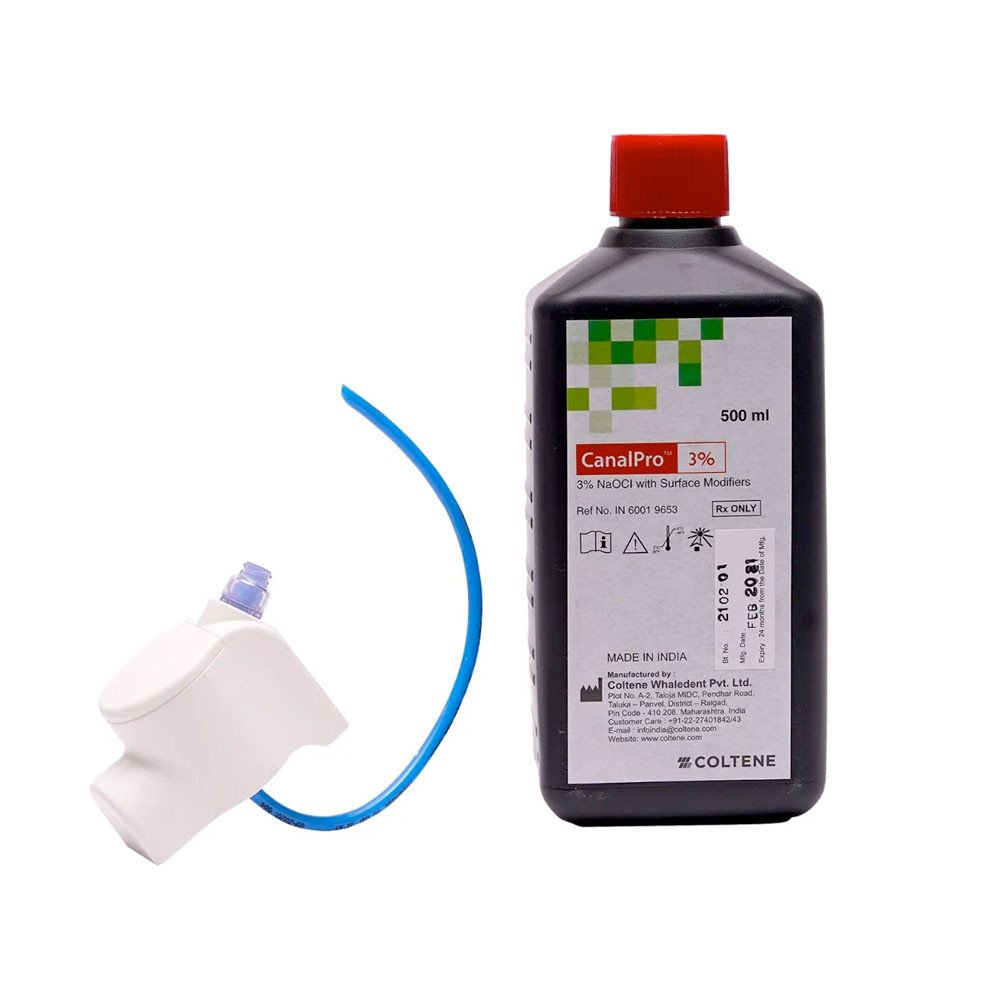 CanalPro NaOCl Irrigant is a specially formulated solution used during root canal procedures to clean and disinfect the canals. It helps eliminate bacteria, debris, and other impurities, ensuring a sterile environment for treatment. Available in both 3% and 5.25% strengths, it provides options to suit different clinical requirements. Known for its strong antimicrobial action, this irrigant supports effective cleaning and enhances the success of root canal therapy by maintaining high levels of hygiene.