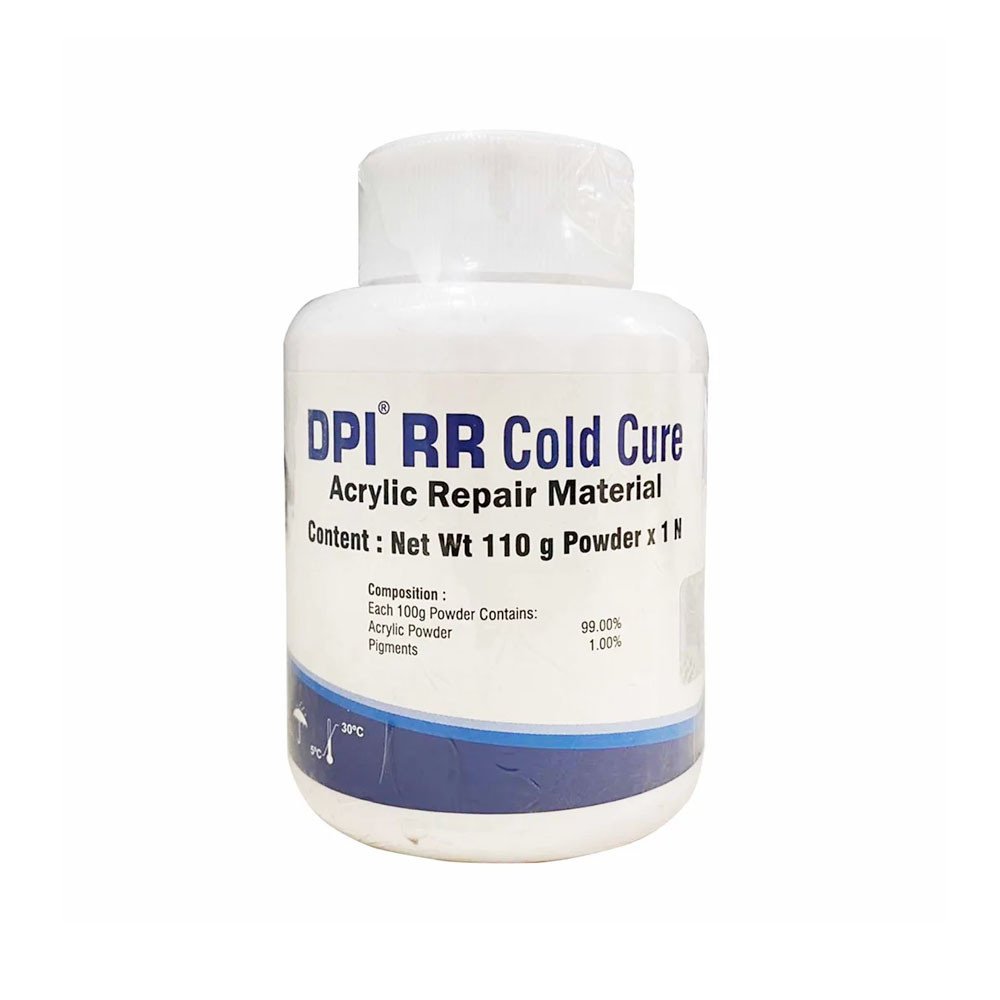 DPI RR Cold Cure is a self-curing acrylic material commonly used for repairing acrylic dentures. It offers a convenient working time and sets quickly, allowing dental professionals to complete repairs efficiently.
