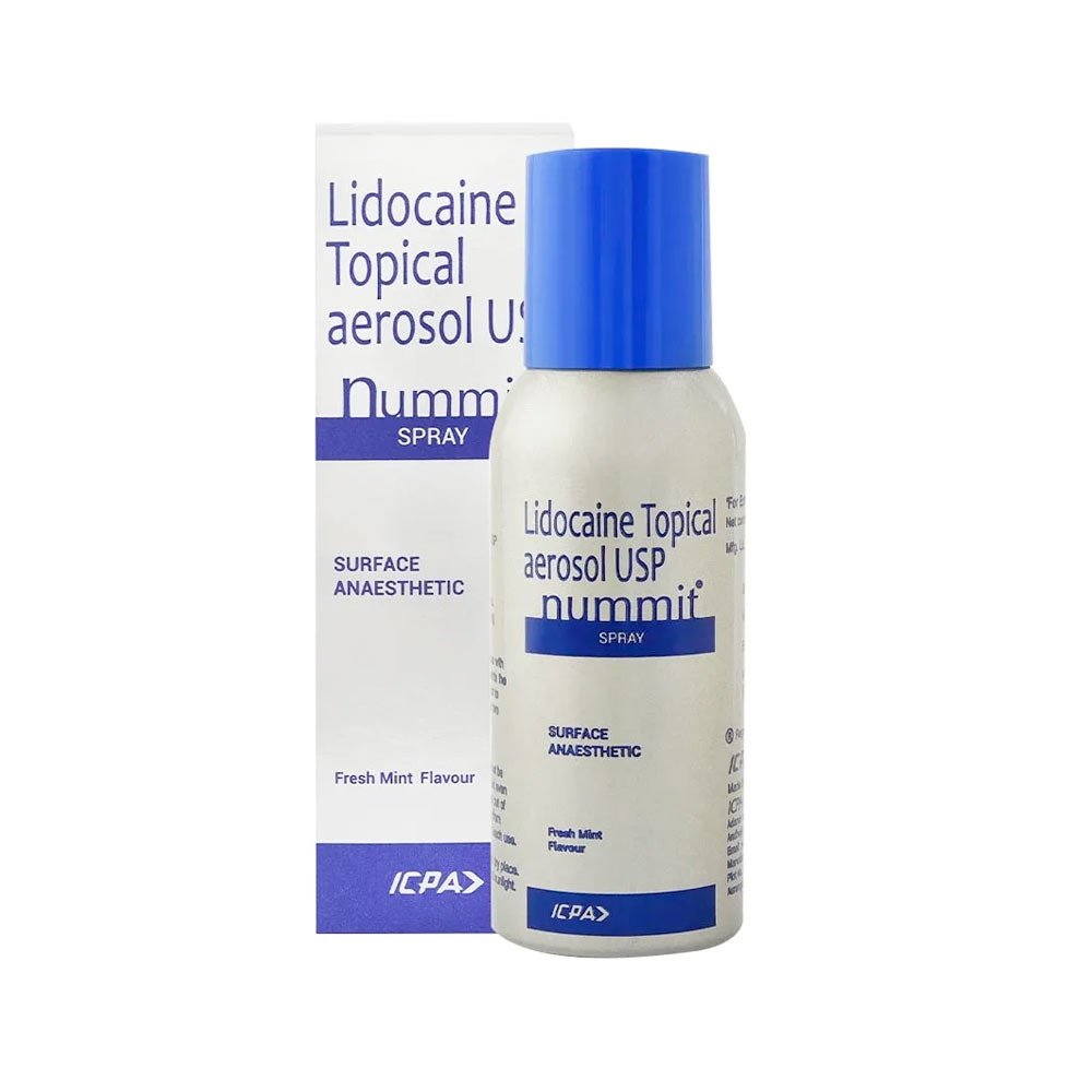 Nummit Topical Anesthetic Spray belongs to the group of local anaesthetics known as amide-type local anaesthetics. It is used to produce local numbness (anaesthesia). It works by reversibly block nerve transmission, when applied to a limited area of the body. Its active ingredient lidocaine bind to the sodium channels in the nerve membrane and prevent the entry of sodium ions in response to the membrane’s depolarization.