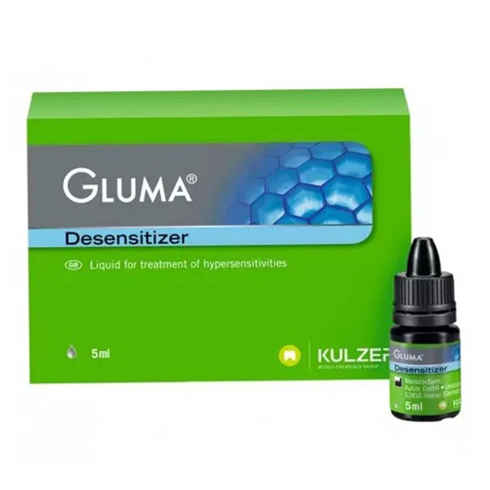 GLUMA Desensitizer is used for the treatment of hypersensitive dentine. It achieves its effects by precipitation of plasma proteins, which reduces dentinal permeability and occludes the peripheral dentinal tubules. This inhibits the flow of fluid through the tubules which is the cause of sensitivity.