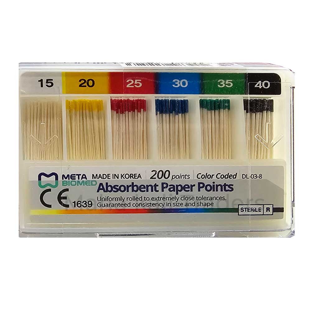 Meta Absorbent Paper Points with 2% absorption capacity are specialized dental tools crafted for endodontic procedures.