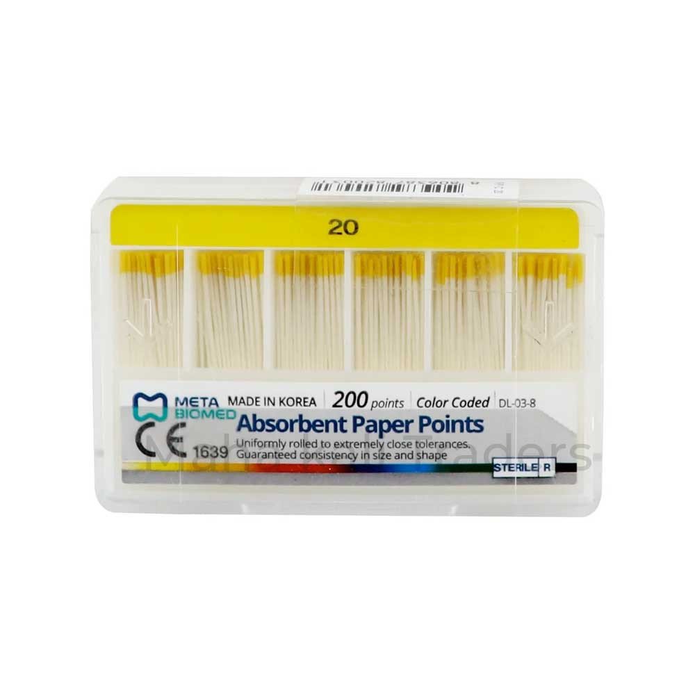 Meta Absorbent Paper Points with 2% absorption capacity are specialized dental tools crafted for endodontic procedures.