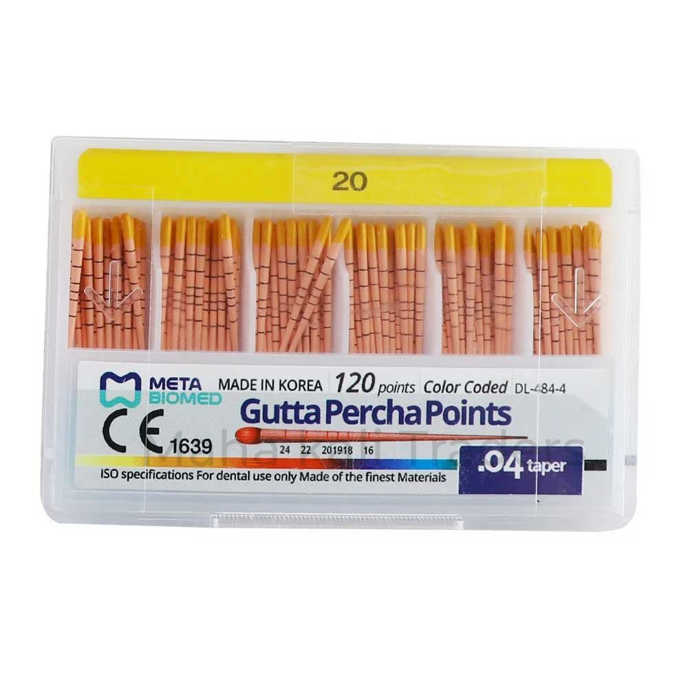 Meta Gutta Percha Points Special Taper - 4% are advanced dental obturation points designed for root canal therapy. Composed of the finest Gutta Percha, these points exhibit exceptional biocompatibility, remaining inert and non-reactive with body fluids. Their dimensional stability ensures minimal expansion or shrinkage, occurring only during phase transformation. With excellent ductility and malleability, the points are stiff yet flexible, offering optimal working qualities during procedures. Uniformly hand-rolled into 4% tapering cones, they provide easy manipulation and ideal apical sealing, critical for preventing reinfection. The points' beta phase Gutta Percha composition, combined with excellent radiopacity, ensures visibility on X-rays for accurate assessment. Suitable for both vertical and lateral condensation techniques, these points assure a uniform and non-distorting crimp. With a long shelf life and freshness assurance, Meta Gutta Percha Points Special Taper - 4% stand as a reliable choice for endodontic procedures, meeting the highest standards of quality and efficacy.