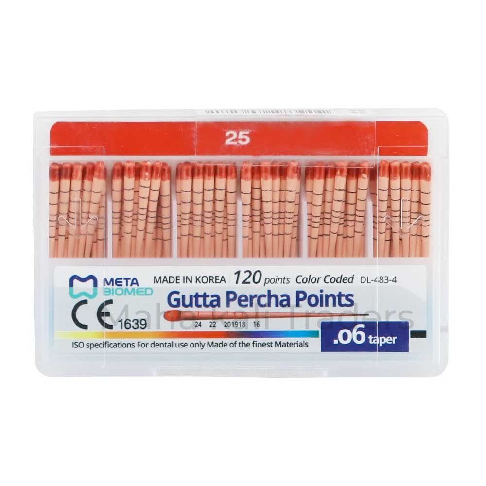 Meta Gutta Percha Points Special Taper - 6% are precision-engineered dental instruments designed for optimal root canal obturation. Available in sizes 15-40, these points feature a 6% taper, ensuring a secure fit in prepared root canals. The special taper, combined with excellent radiopacity, makes them versatile for various canal shapes and provides clear visibility during X-rays. Their length marking feature aids in precise depth measurements, facilitating accurate placement. Compatible with Cold Lateral Compaction, lateral compaction, and the Cone technique, these points offer flexibility in procedural choices. Biocompatible, moisture-resistant, and dimensionally stable, they contribute to successful root canal treatments. The pre-measured points save chair time, providing a reliable solution for preventing reinfection by completely sealing the canal. Dental professionals appreciate their ease of manipulation, ideal working qualities, and consistent results, making Meta Gutta Percha Points Special Taper - 6% an essential component in endodontic practices.