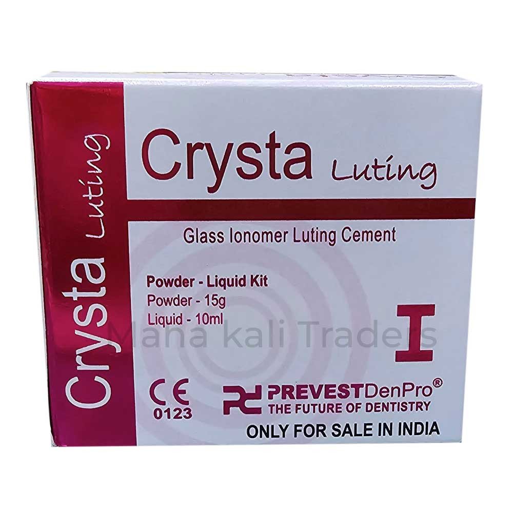 Crysta Luting is a convenient self curing , fine particle, fluoride releasing, glass ionomer luting cement for crowns , bridges, securing inlays, onlays, post and orthodontic brackets.