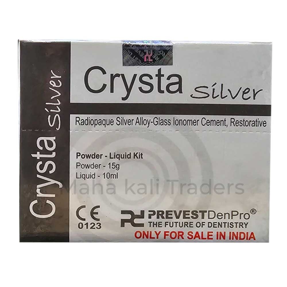 Crysta Silver is PRE MIXED radiopaque, silver alloy Glass lonomer Cement for restoration of primary teeth, core build up, restoration of class I, limited class II cavities and as a base and liner material. Crysta Silver which is reinforced with spherical silver alloy has high compressive and adhesion to the tooth. It has excellent tooth adhesion, sustained fluoride release and high compressive strength.