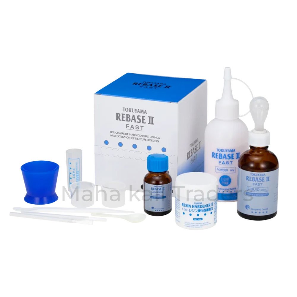 Tokuyama ReBase ll Kit Denture Relining Material is a chairside hard denture reline material designed to enhance dental prosthetic procedures. This advanced kit offers improved features over its predecessor, Tokuso Rebase, including better polishability, reduced heat generation during in-mouth curing, heightened mechanical strength, enhanced handling, and minimized odor/taste. The material cures intraorally in a rapid 4 minutes and 30 seconds, streamlining the chairside process for both dentists and patients. Specifically indicated for hard denture relining and partial denture repairs, it ensures accurate adaptation, durability, and lower chemical irritation. With a recommended storage temperature of 0-25°C, proper handling, and disposal guidelines, the Tokuyama Rebase II Kit prioritizes safety, efficiency, and patient comfort, making it a valuable tool for licensed dental care professionals in one-appointment procedures.