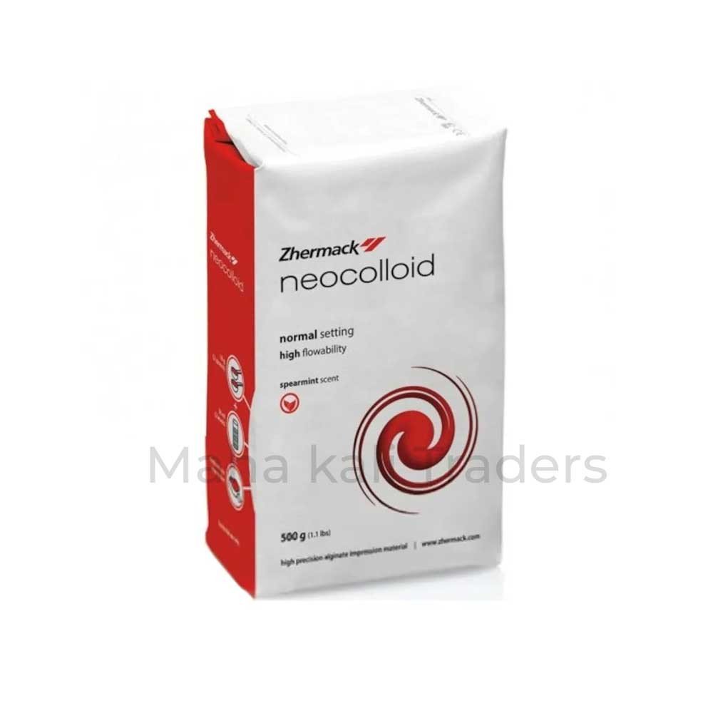 Zhermack Neocolloid Alginate Impression Powder - 500g - Neocolloid by Zhermack is a high precision alginate impression material used to make precision dental impressions. Neocolloid is a dust free alginate, with normal setting time. It exhibits fast absorption of water and enhances the ease of mix. The final mix of the impression material is a homogenous mass with smooth and compact surfaces.