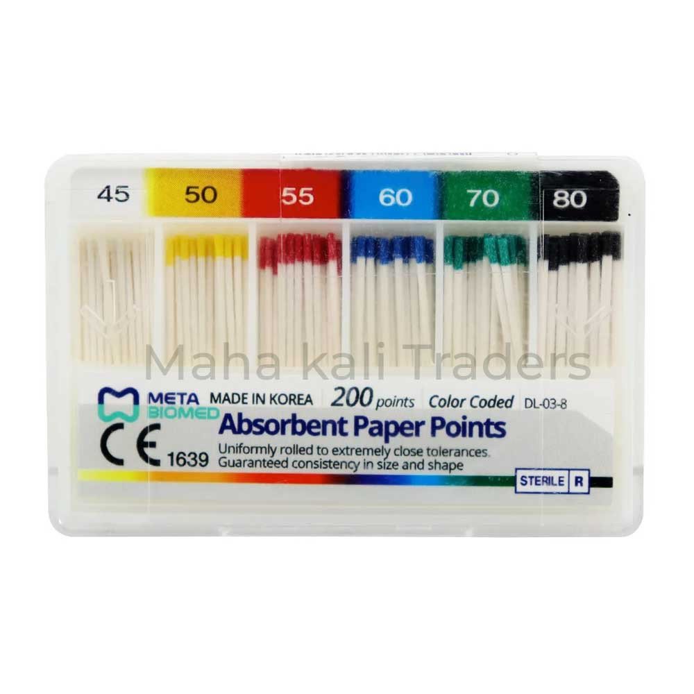 The rigid construction of these points prevents curling or bending, allowing smooth insertion and withdrawal from canals. Firmly rolled to maintain shape, these points contribute to effective moisture control, creating an optimal environment for dental procedures. Individually sterilized and packaged, Meta Absorbent Paper Points adhere to stringent hygiene standards.